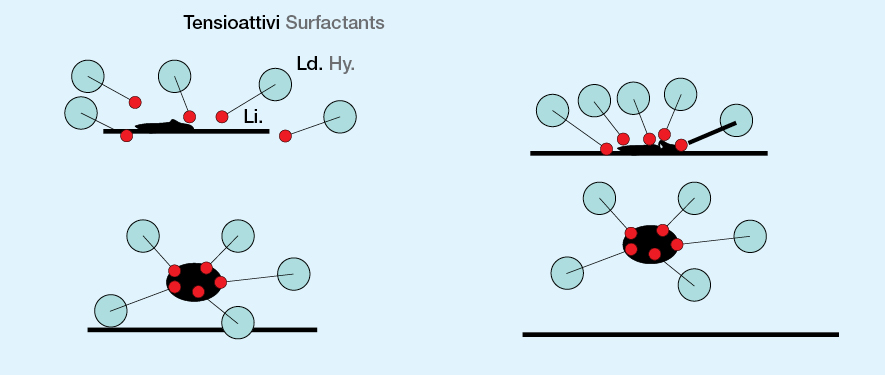 Lo sporco grasso aderisce intimamente alle fibre, rendendo inefficace il lavaggio con sola acqua. Il tensioattivo si lega al grasso tramite la parte lipofila e all’acqua tramite la parte idrofila, creando un ponte grasso–detergente che permette la formazione di emulsioni stabili.